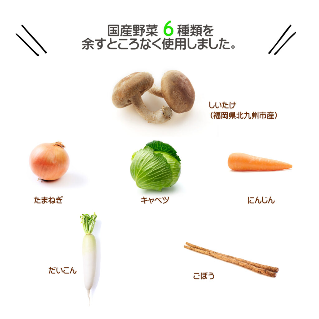 椎茸粉末(福岡県産)、キャベツ粉末、玉葱粉末、人参粉末、大根粉末、ゴボウ粉末